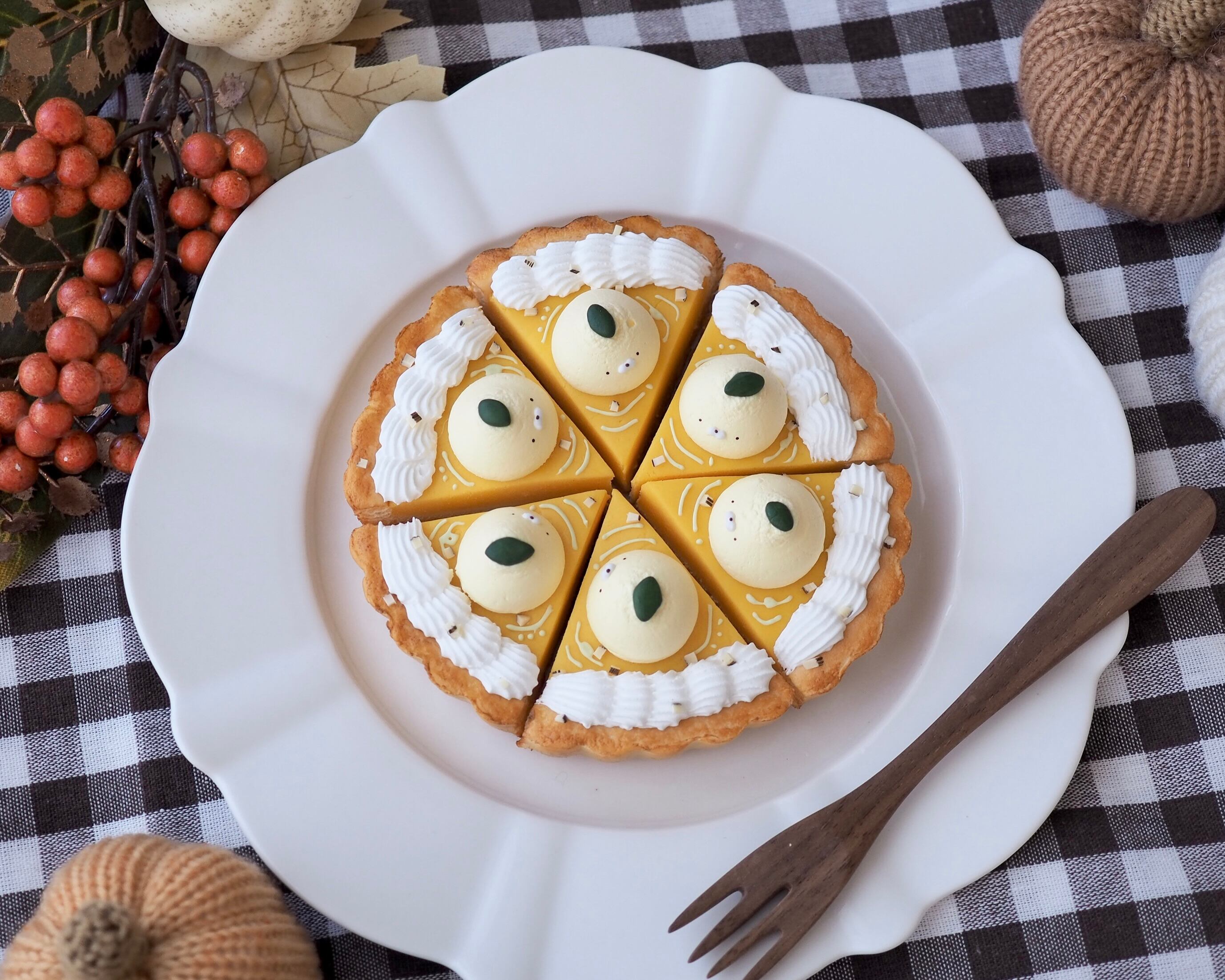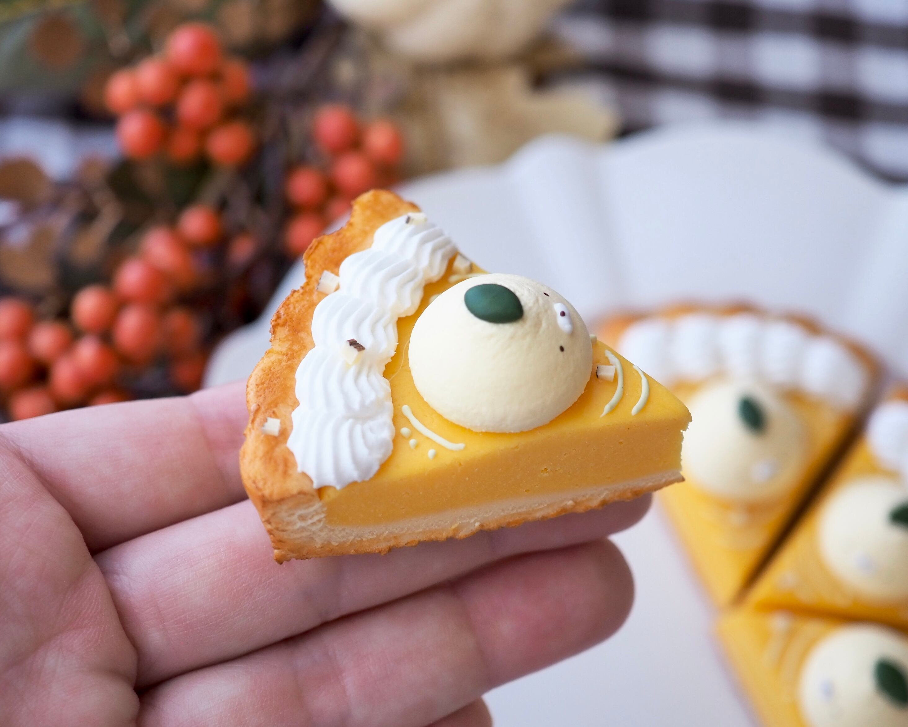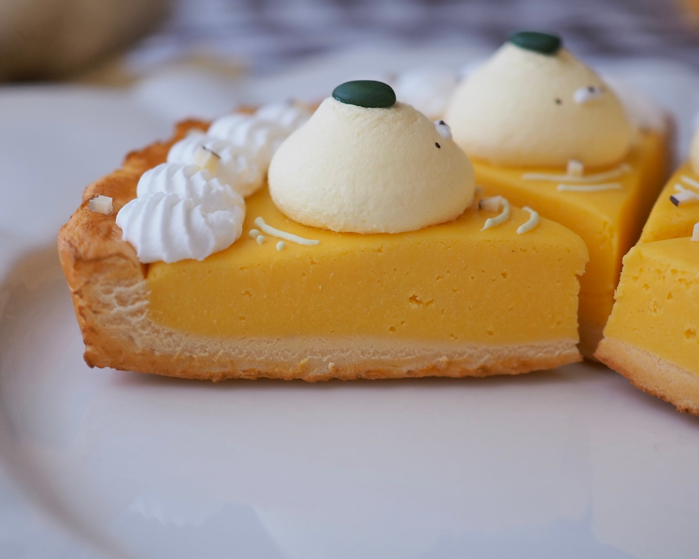 しっとり濃厚なかぼちゃプリンのタルトにごまふぅホイップクリームをトッピングしました。